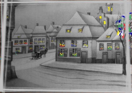 Les fenêtres une à une, se peuplent. Dans chaque maison, il y a une femme qui a laissé son souper et qui joue avec les pains de cire et les couleurs de verres.